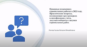 Вебинар Союза муниципальных контрольно-счетных органов на тему «Строительные работы в 2023 году. Практические вопросы, возникающие при проверках классификации, учета и документооборота, закупки строительных работ» состоялся 3 февраля 2023 года в режиме видеоконференцсвязи. Лектором мероприятия выступила Директор Центра внутреннего контроля и обучения АНО «Институт дополнительного профессионального образования «Международный финансовый центр», кандидат экономических наук Наталия Гусева.