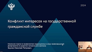 Видеоконференция на тему «Конфликт интересов на государственной гражданской службе. Практика Счетной палаты Российской Федерации» проведена начальником отдела профилактики коррупционных и иных правонарушений Департамента по развитию человеческого капитала аппарата Счетной палаты Российской Федерации Николаем Кручеком.